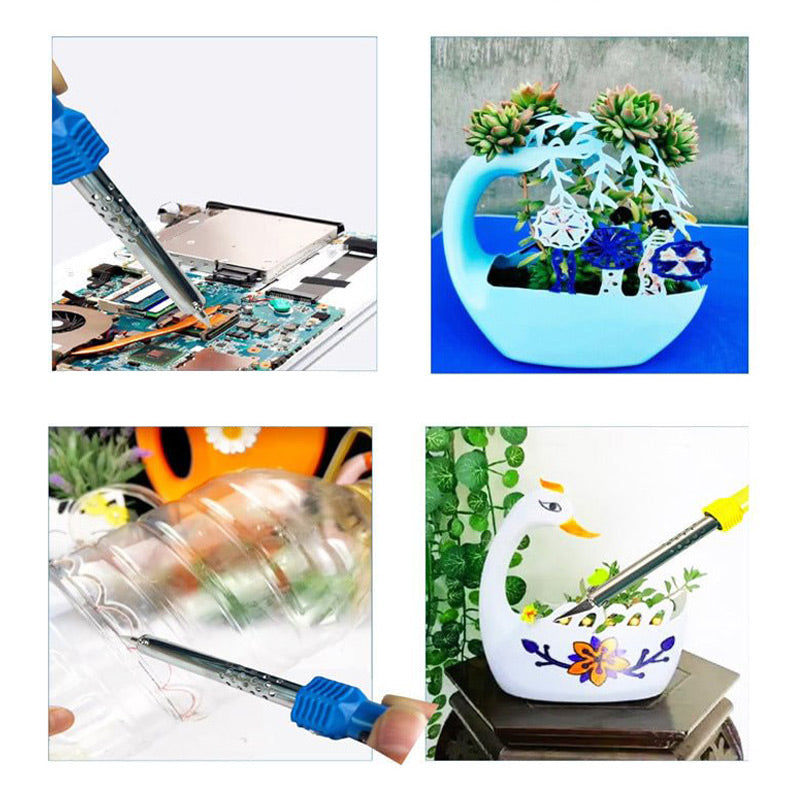 SOLDERING IRON ENGRAVING SET - The set includes: 5 replaceable blades, 1 screwdriver, 2 chucks, and 1 plug of different specifications. This lightweight electronic product soldering kit is portable, easy to use or carry, just plug and play use.