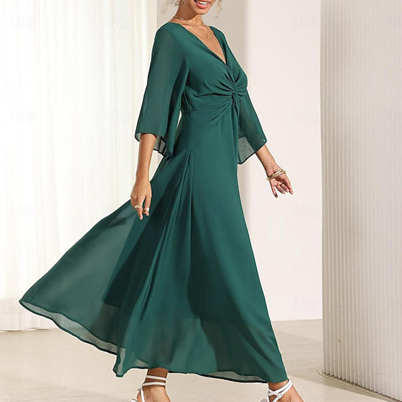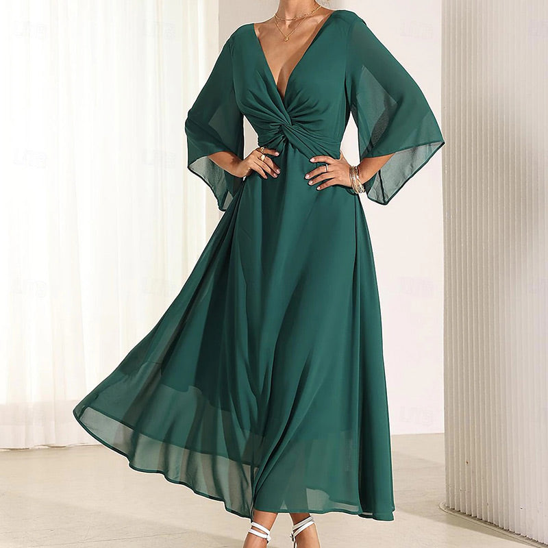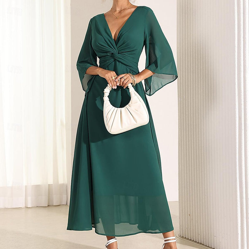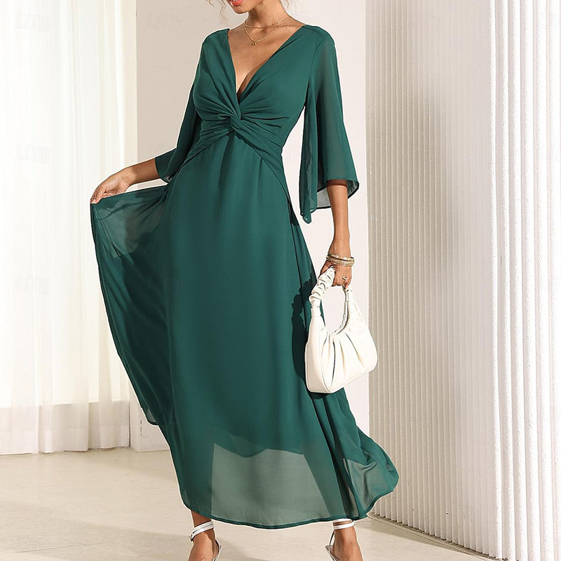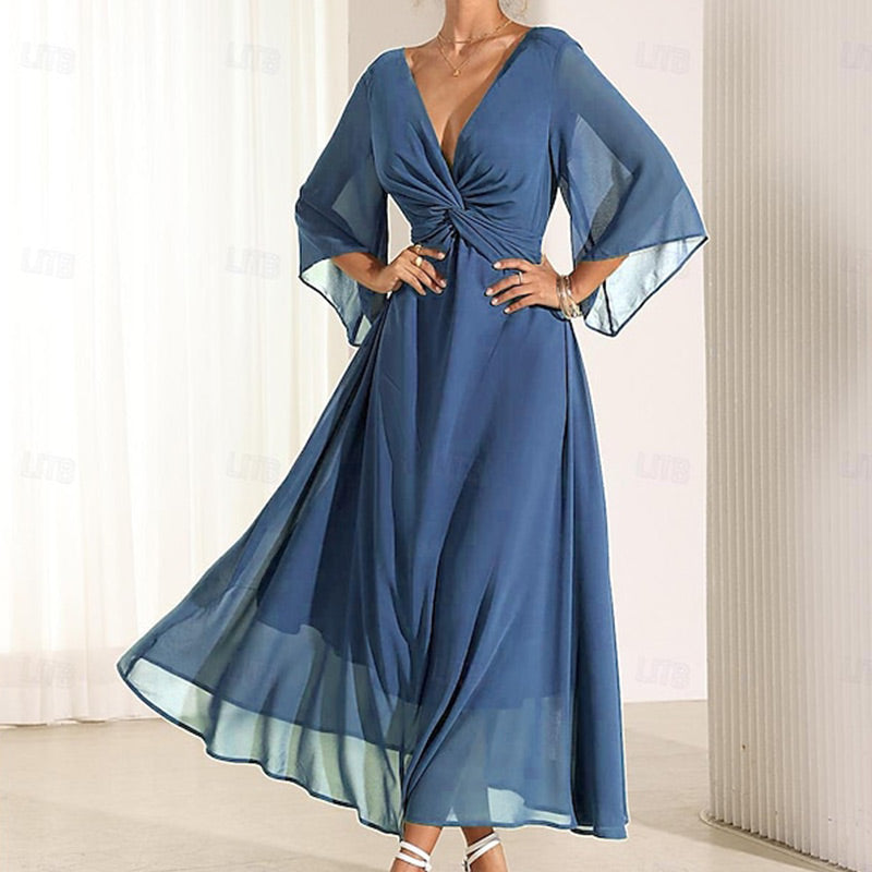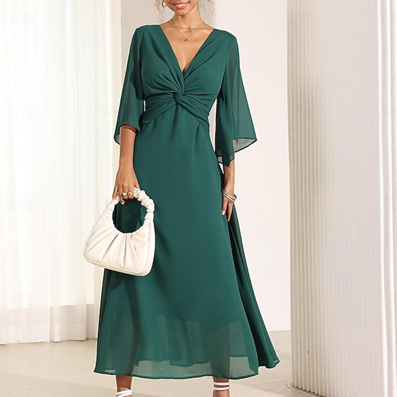 Women's Elegant Chiffon Twisted Dress with V-Neck & Flared Sleeve